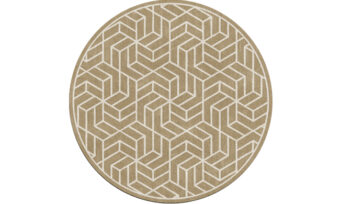 Printed vinyl rug / linoleum mat, with a graphic pattern simulating fabric in beige, blue, black, dark gray, gray and yellow.